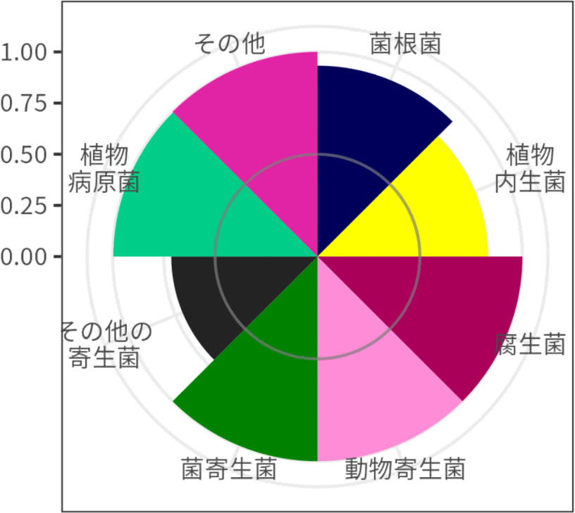 上のグラフは関わっている会社の試験ほ場の生物性分析の結果になるが、栽培者にとって有益な菌だとされる菌根菌、植物内生菌、菌寄生菌や動物寄生菌が多く検出されていて、施肥と土壌の微生物叢の関係で見えるものが増えてきた。