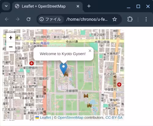 marker.bindPopup("Welcome to Kyoto Gyoen!");