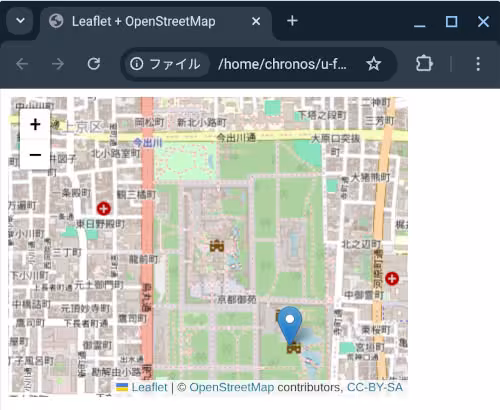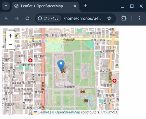 LeafletでOpenStreetMapの地図を出力してみようで出力しました地図にピン(マーカー)を立ててみます。