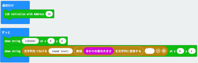 LCD initialize with Addressで 39 を指定し、ずっとブロックないでshow stringブロックで16文字以内の半角英数字と記号を入力します。