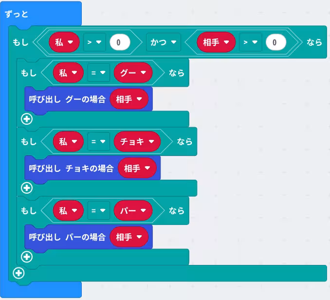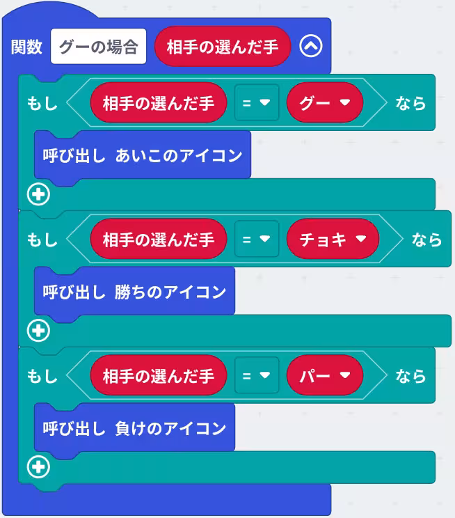 私がグーの場合を用意して、そのブロック内に相手がグーの場合、チョキの場合とパーの場合を用意して各々に適切な状態(勝ち負けのアイコン)の関数の呼び出しを加えます。