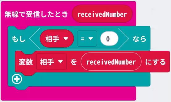受信した場合、相手の選択した手の記録用の変数に受信した内容を記録しておきます。