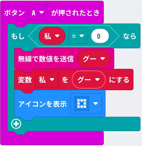 このようにボタンAを押したら、相手にグーを選択したことを伝えるコードと、私の選んだ手を記録する為の変数にグーの定数を登録します。