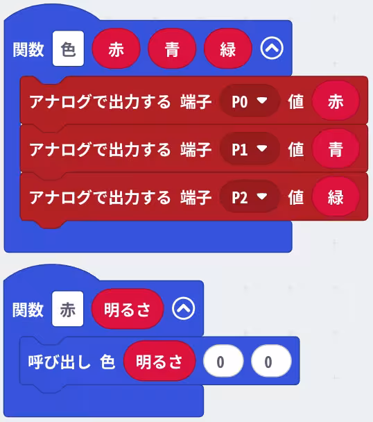 関数 色のブロックでは、アナログ出力の値で赤、青、緑の順で値を入れます。