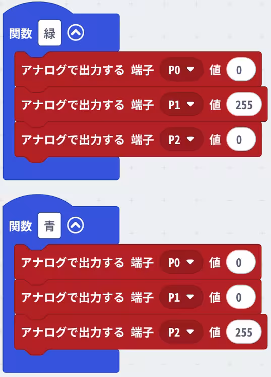 関数「赤」のブロックが表示されていますので、LEDが赤に点灯するようなコードを作成しておきます。
