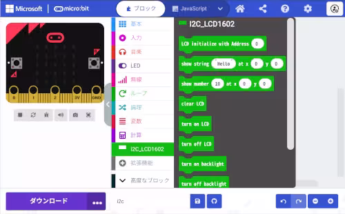 MakeCodeの標準機能でLCD1602に文字列を表示する事は難しいので、拡張機能を利用します。