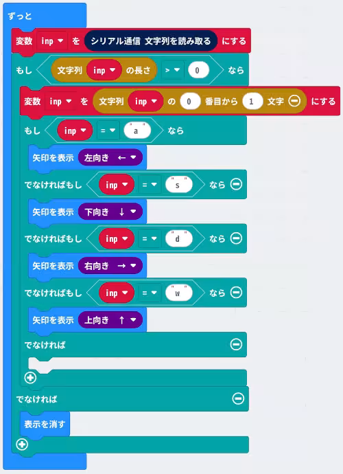 マイクロビットでパソコン側のブラウザとやり取りするためのコードを作成します。